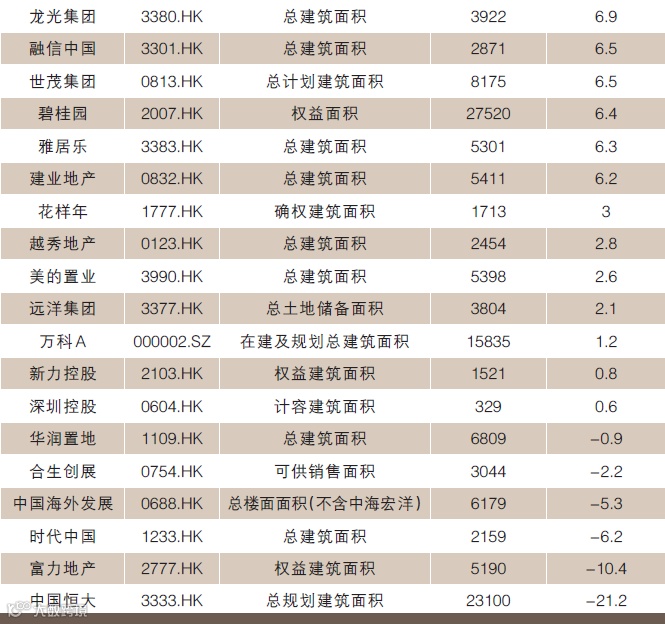 从列入统计的38家公布了土地储备数据的上市房企看,碧桂园、融创中国、中国恒大、万科A、新城控股土地储备建筑面积(统计口径略有差别)均超过1亿平方米,分别达到27520万、25772万、23100万、15838万、14300万平方米。从土地储备增速看,建发国际、绿城中国、中国奥园土地储备面积同比增长最快,分别为31.8%、31.1%和27%。