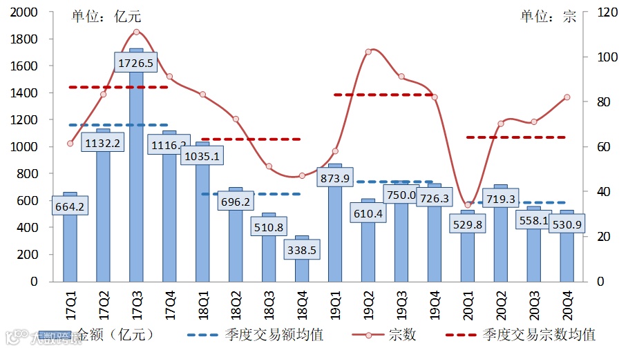 2020年收并购交易金额与宗数同比均下降超20%。具体来看,境内房地产公司作为买方完成的收并购事件约有257宗,涉及的交易金额约2338.1亿元,同比分别下降22.8%、21.0%。分季度发展来看,2017年三季度达到峰值,此后逐渐回落至2018年底,2019年一季度交易金额再次上涨,之后各季度的交易规模保持较为稳定发展;2020年二季度由于有两笔百亿以上的交易,当月收并购金额达719.3亿元,位于全年最高,四季度收并购交易宗数为82宗,收并购市场较为活跃。