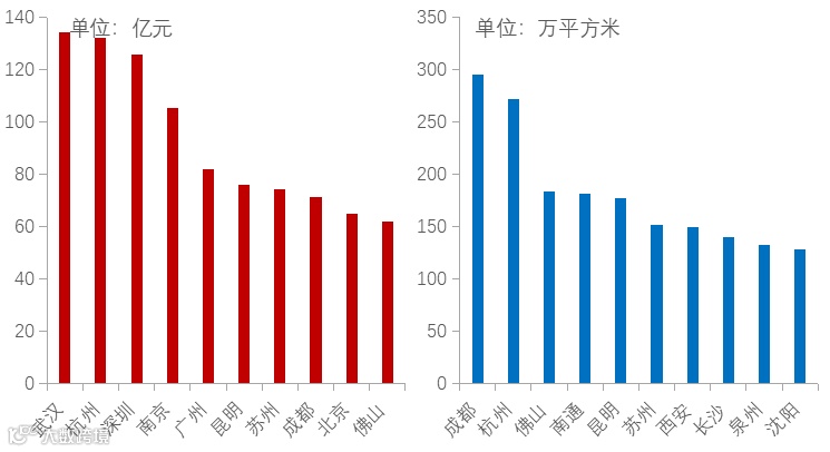 图:2020年百强TOP30房企收并购拿地金额前十城市(左)和拿地面积前十城市(右)