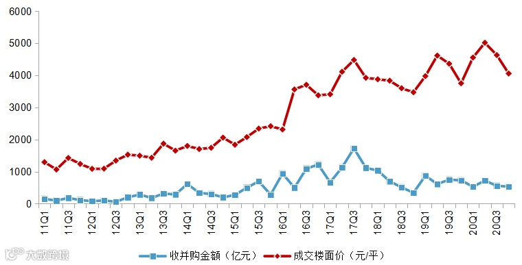 图:2011-2020年房企收并购金额与同期全国300城成交楼面均价关系图