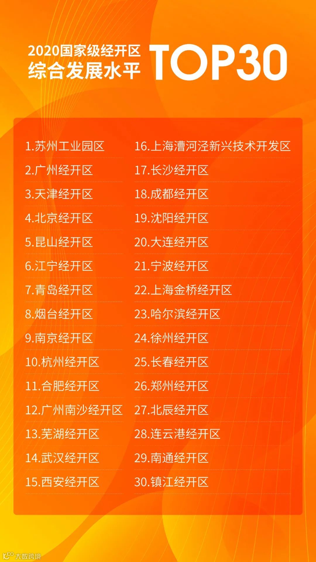 2021年1月27日,商务部召开专题发布会,揭晓全国218家国家级经开区年度考核成绩单,榜单包括「综合发展水平30强」、「吸引外资10强」、「进出口总额10强」。