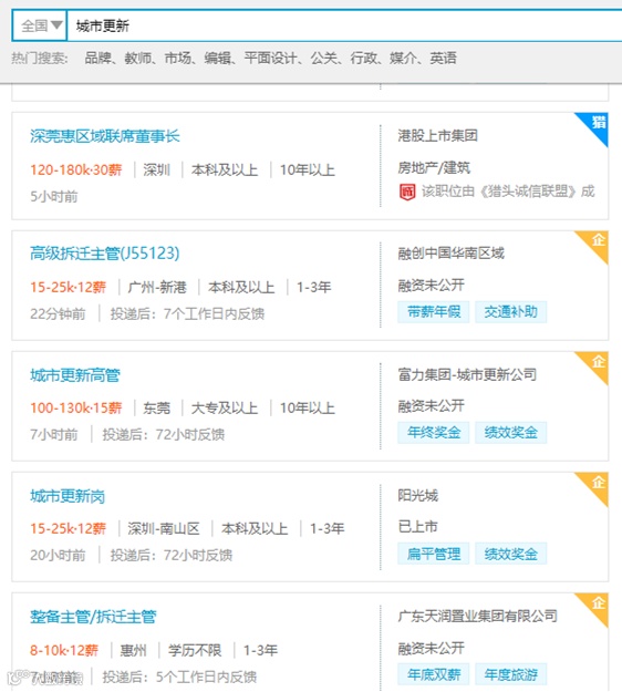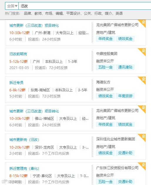 在各大招聘平台以“城市更新”、“旧改”为关键词进行职位搜索,可以看到大量房企正在高价招聘旧改人才。近3天发布过相关招聘信息的房企数量多达近100家,值得注意的是,位于广州、深圳、东莞、佛山等大湾区的房企发布招聘需求居多。