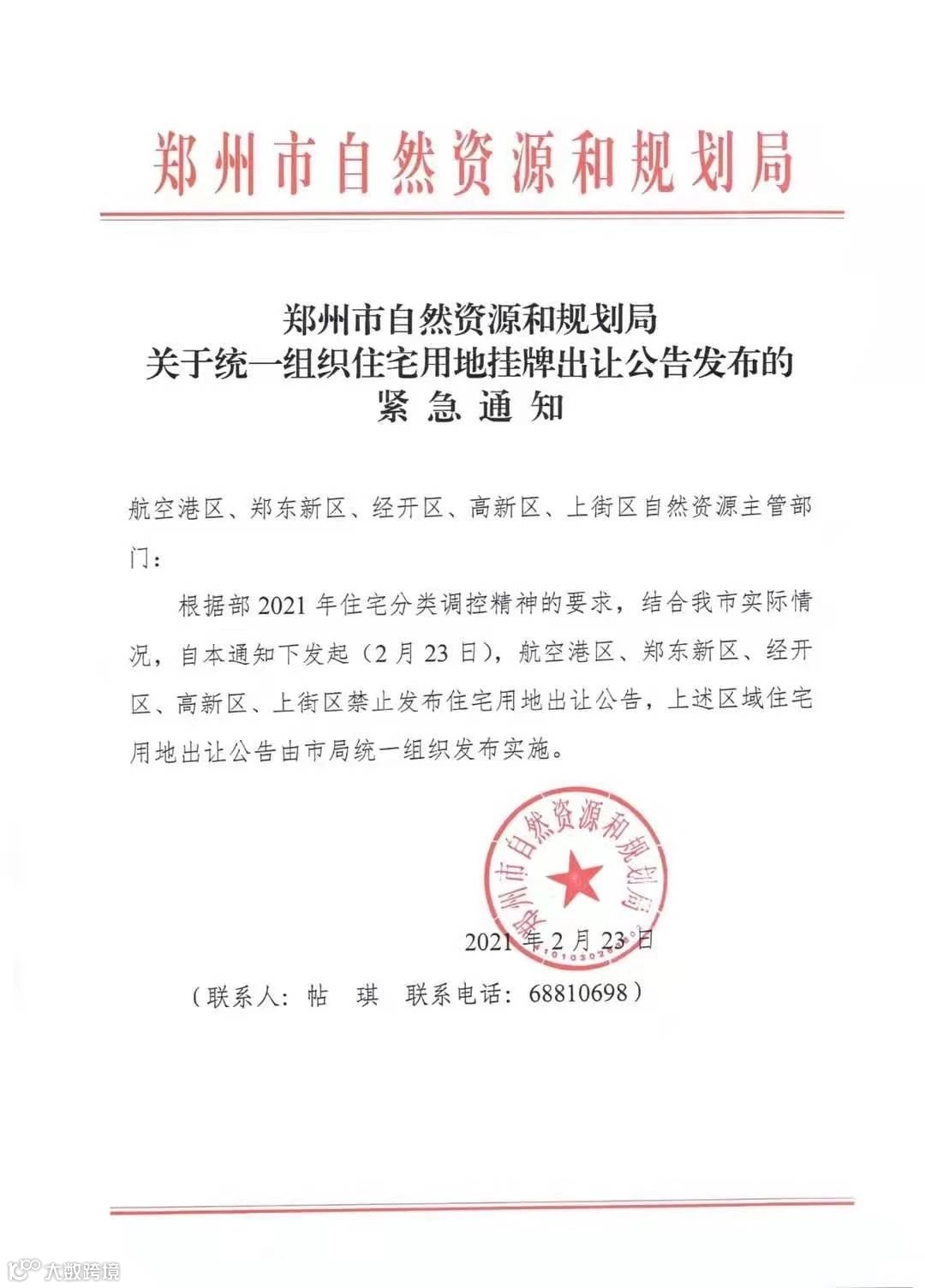 郑州通知称,根据部2021年住宅分类调控精神的要求,结合郑州市实际情况,自本通知下发起(2月23日),航空港区、郑东新区、经开区、高新区、上街区禁止发布住宅用地出让公告,上述区域住宅用地出让公告由市局统一组织发布实施。