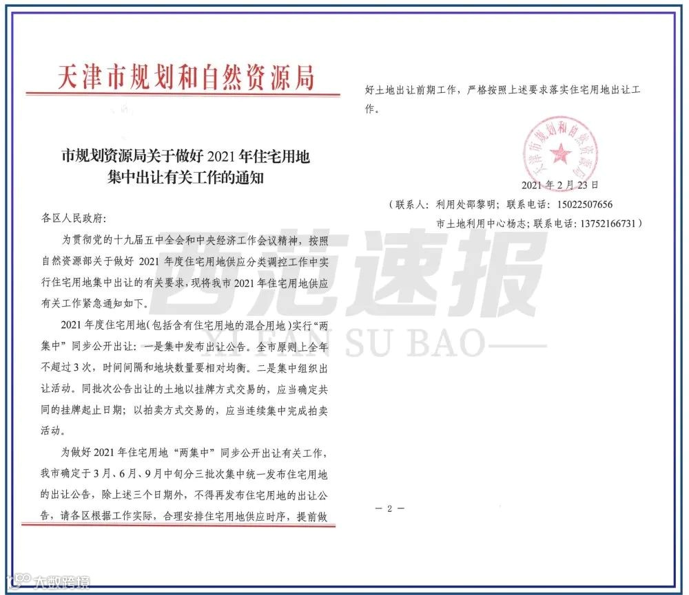 2月24日,一份由天津市规划和自然资源局发布的《市规划资源局关于做好2021年住宅用地集中出让有关工作的通知》显示,天津市确定于今年3月、6月、9月中旬分三批次集中统一发布住宅用地的出让公告,除上述三个日期外,不得再发布住宅用地的出让公告。上述《通知》的落款时间显示为2021年2月23日。
