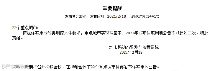 近日,网传2月18日住建部发文直接监控22个热点城市,对重点城市实施两集中(集中发布出让公告,集中组织出让活动),2021年发布住宅用地公告不能超过3次。