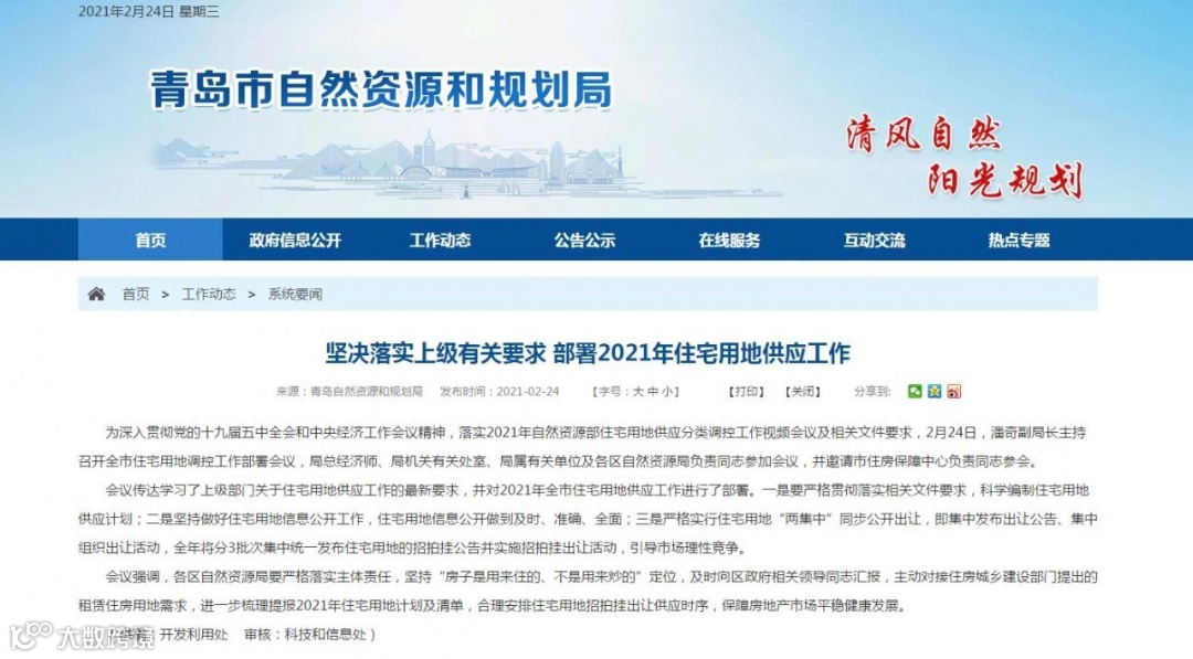2月24日,山东省青岛市自然资源和规划局官网发布《坚决落实上级有关要求 部署2021年住宅用地供应工作》的通知。