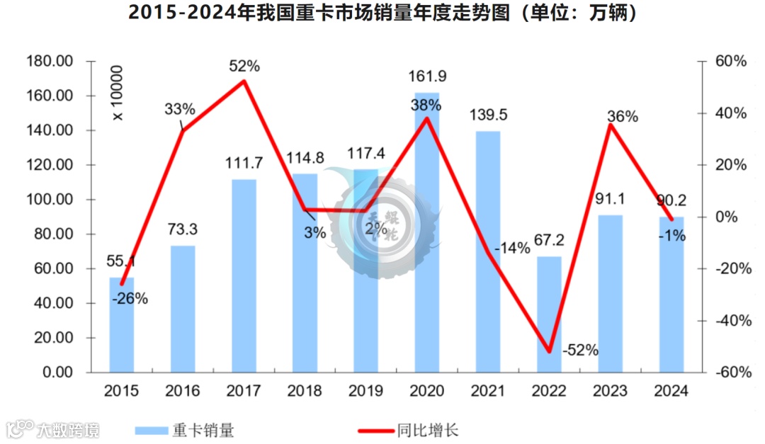 2024年中国重卡市场呈现"全年微降、年末反弹"的特征。全年总销量约为89.7万辆至90.17万辆,同比下降1.03%-2%,但12月单月销量达7.9万辆,环比增长15%,同比增幅达52%,显示出强劲的年末复苏迹象。这种波动主要受经济环境变化、运价低迷导致换车需求不足,以及新能源产品占比提升等多重因素影响。值得注意的是,国内市场实际呈现下降态势,而出口市场成为重要支撑。
