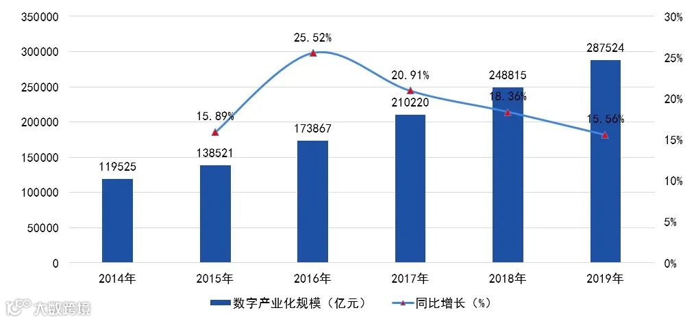 图表:2014-2019年中国数字产业化增加值规模情况(单位:亿元,%)