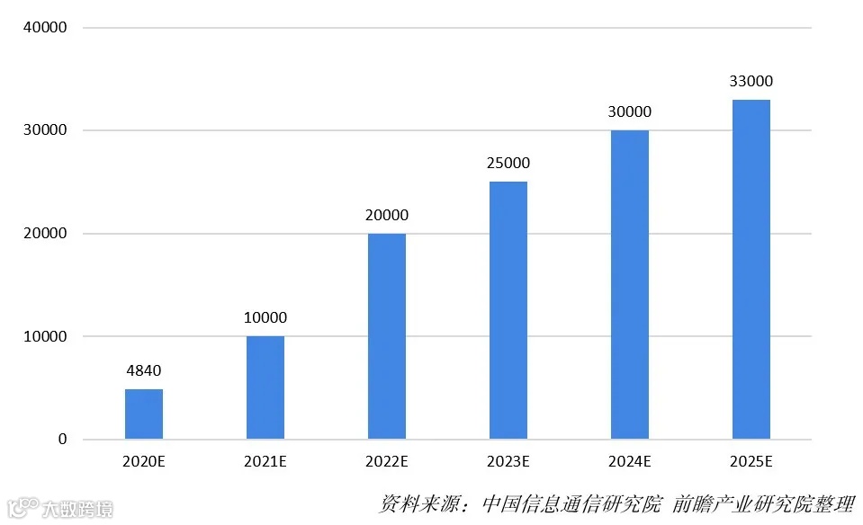 数字经济关键技术主要有5G、人工智能、大数据及云计算等,是推动数字经济增长的基础设施,也是数字产业的关键应用市场,预计到2025年5G、人工智能、大数据及云计算市场规模共计将达到60431亿元左右。