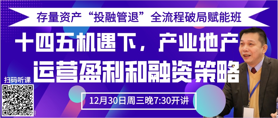 “十四五”的机遇之下,针对产业地产运营提升、投融管退及盈利策略的实战解析,我们将于12月30日(下周三晚)进行讲解,时长不低于两小时,扫码可查看,报名即赠完整课件资料: