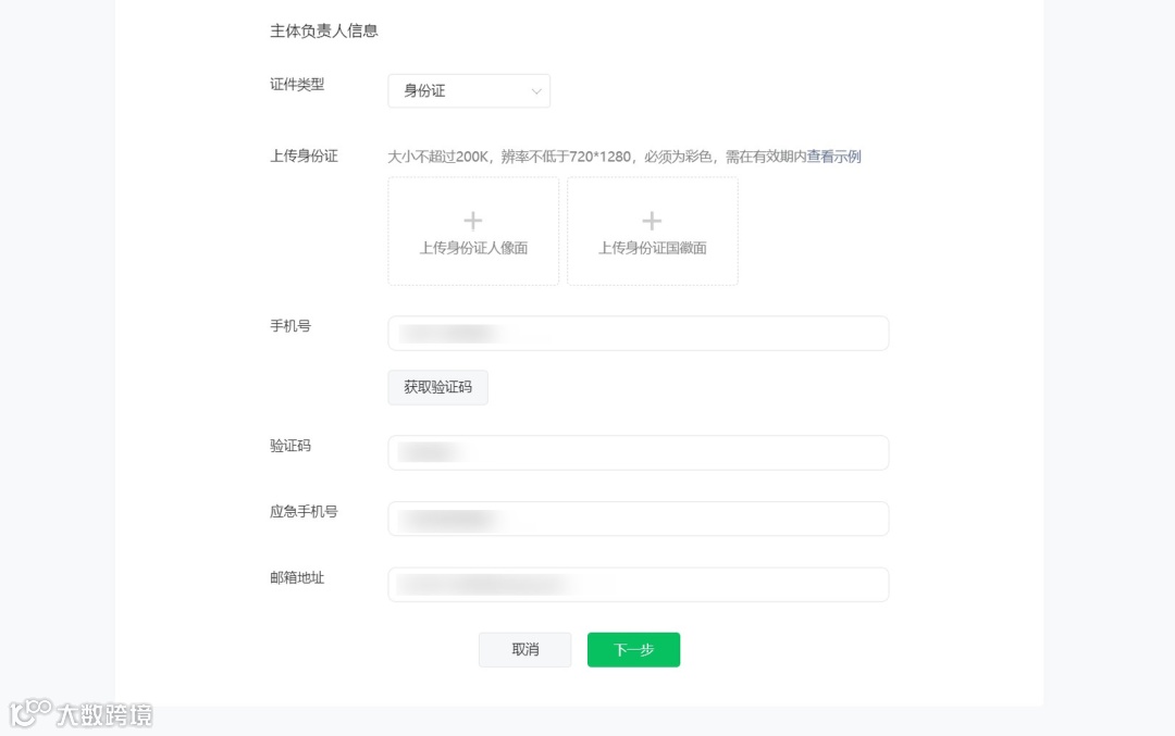 2、法人资料:法人身份证正反面、法人手机号、应急手机号(不得与法人手机号相同)、邮箱号码;