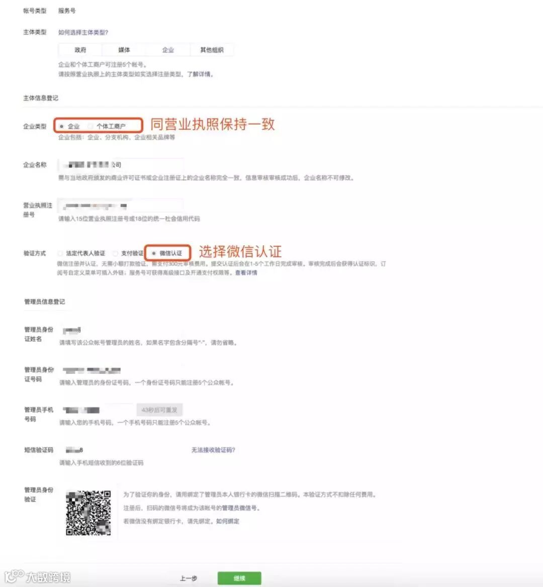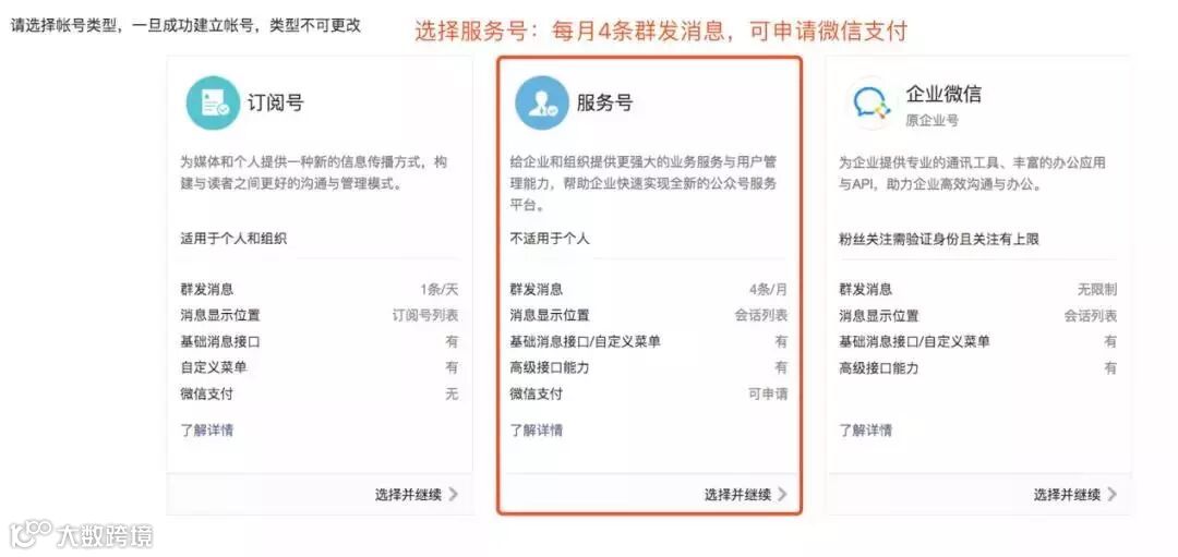 订阅号和服务号优缺点各不相同,这里我们选择【服务号】