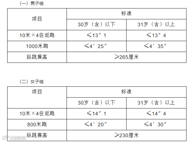 体能测试项目为:①纵跳摸高②10米×4往返跑③男子1000米跑;女子800米跑。标准参照《公安机关录用人民警察体能测评项目和标准》执行。如下: