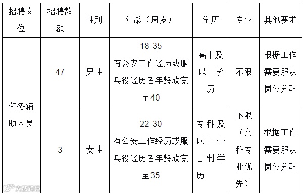 为满足我县公安机关用人需要,保障社会治安秩序稳定,决定以劳务派遣方式招聘警务辅助人员50名,为保证公开招聘工作顺利实施,现公告如下: