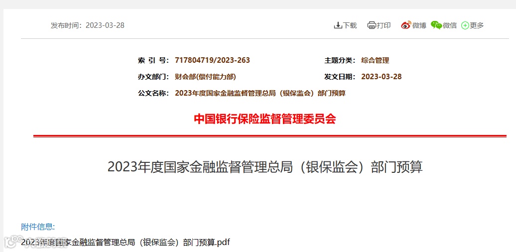 银保监会于3月28日发布《2023年度国家金融监督管理总局(银保监会)部门预算》(以下简称《预算》)。其中明确,国家金融监督管理总局(银保监会)2023年收支总预算1063081.87万元。