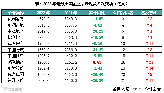 特别是在当前的行业周期下,央国企表现出更强的发展韧性。具体来看,2022年有近9成的百强房企累计业绩同比下滑,累计业绩同比降幅大于50%的企业数量达到36家,另有32家百强房企累计业绩降幅在50%至20%之间。但保利、华润、中海、招商、建发、越秀、华发等央国企的业绩表现却明显优于规模房企整体水平。其中,越秀2022年全年实现全口径销售金额1250.3亿元,同比增长8.6%,是为数不多业绩规模实现正增长的企业之一;全口径金额名次排在第16位,行业排名跃进TOP20。且在市场整体下行调整的行业背景下,仍超额完成了全年1235亿元的业绩目标。