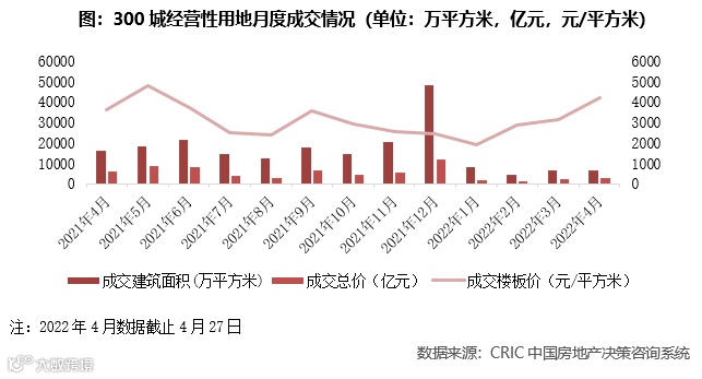 截至4月27日,全国300城经营性土地4月总成交建筑面积仅6537万平方米,同比降幅近六成,成交规模仍处于历史地位水平。但是受到杭州、宁波、南京、天津等城市首轮集中土拍的影响,成交单价结构性上涨,平均楼板价增至4210元/平方米,环比涨幅突出,高达34%,同时也带动成交溢价率环比微增,较上月上涨了0.3个百分点至4.8%。