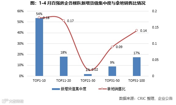 截止至4月末,百强新增货值集中度有一定程度的下降,但仍处于高位:TOP10房企新增货值占百强总货值的54%,11-20强房企新增货值集中度微涨5个百分点,达到18%,主要是滨江、建发在杭州、宁波积极拿地;后50强房企拿地仅占17%,未来可售货值压力较大。