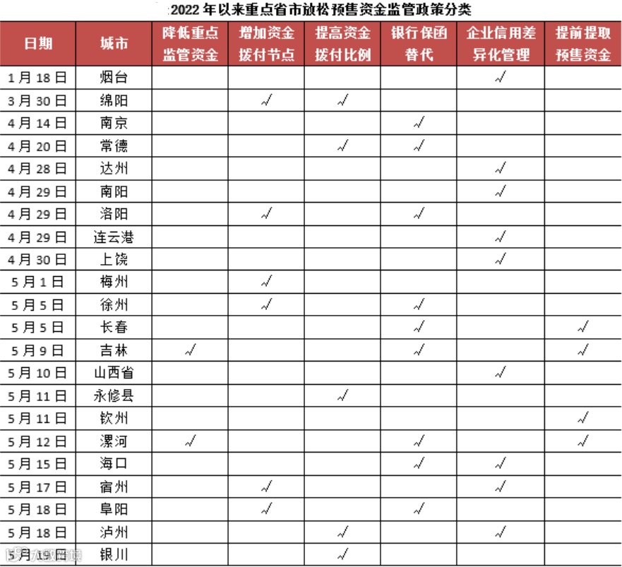 今年4月29日召开的中共中央政治局会议强调,支持各地从当地实际出发完善房地产政策,支持刚性和改善性住房需求,优化商品房预售资金监管,促进房地产市场平稳健康发展。各地预售资金监管政策优化频率明显加快。