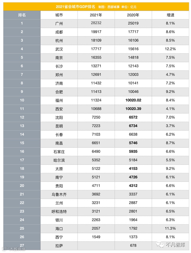 省会城市排名大洗牌,不仅头部城市之间竞争激烈,腰部城市也都在你追我赶。目前来看,全国省会城市十强依次是: