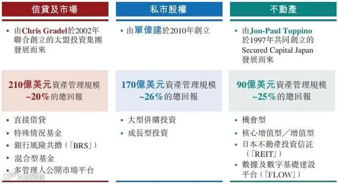 就策略部门而言,31%投资于私募债务,36%投资于私市股权,19%投资于不动产及13%投资于流动性策略及公开市场。公司有能力投资于全方位的投资机会,无论该投资机会为资产或现金流所支持、期限为短期或长期、流动或长期持有控制权,以及良性或不良性资产。