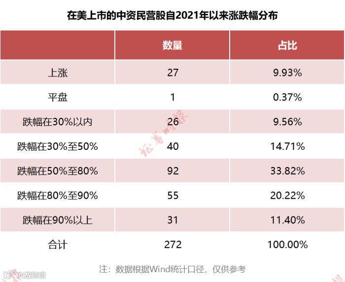 据Wind数据统计口径,目前272只在美上市的中资民营股中,2021年以来合计有244只股票股价出现下跌,占比约九成,这里面有178股累计跌幅超过50%,占比接近2/3,其中31股累计跌幅超过90%,占比超一成。