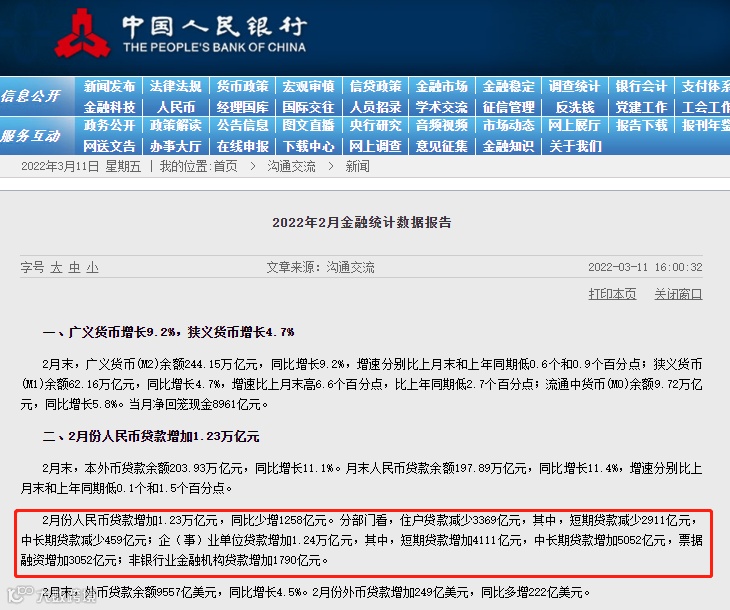 2022年3月11日下午,央行公布2022年2月金融统计数据报告。