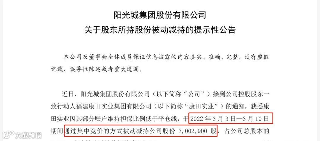 就在3月10日,阳光城公告称,股东福建康田实业集团有限公司所持股份被动减持700.29万股。公告称,康田实业因其部分账户维持担保比例低于平仓线,在3月3日—3月10日期间通过集中竞价的方式被动减持阳光城股份700.29万股,占阳光城总股本的0.17%。