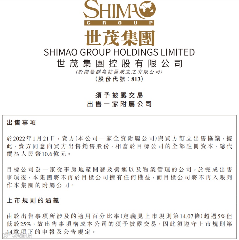 公告显示,世茂方面与上海久事于1月21日签订了出售协议,出售上海世茂置业发展有限公司的全部注册资本。出售完成后,世茂将不再持有上海世茂置业的任何权益。
