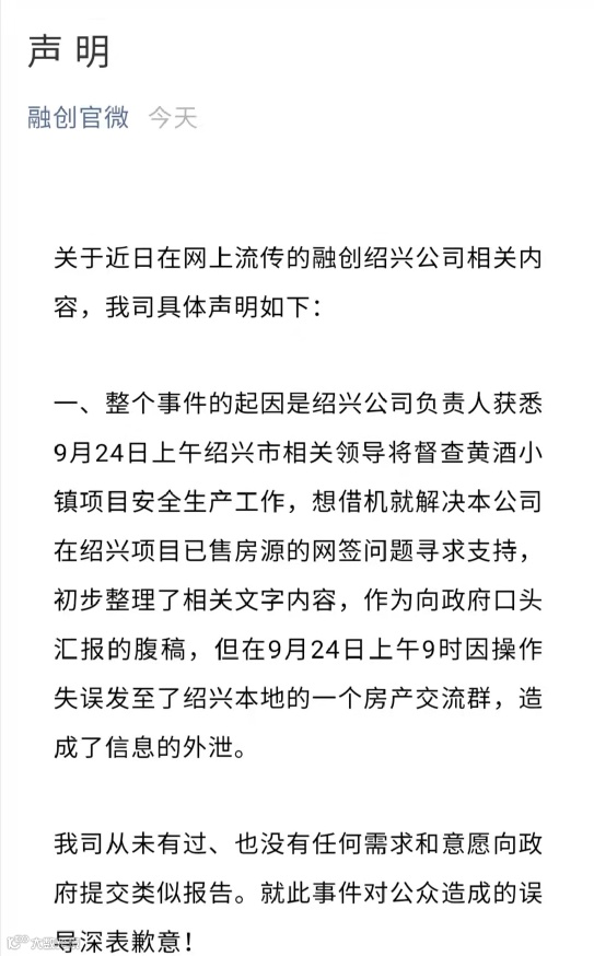 融创称,整个事件的起因是绍兴公司负责人获悉9月24日上午绍兴市相关领导将督查黄酒小镇项目安全生产工作,想借机就解决公司在绍兴项目已售房源的网签问题寻求支持,初步整理了相关文字内容,作为向政府口头汇报的腹稿,但在9月24日上午9时因操作失误发至了绍兴本地的一个房产交流群,造成了信息的外泄。