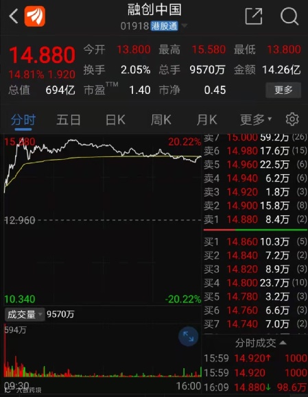但9月28日融创股价迎来大幅反弹,开盘大幅高开,随后拉升一度涨近20%,随后全天维持高位震荡,收盘涨幅依然近15%,基本收复此前两个交易日大跌的“失地”。