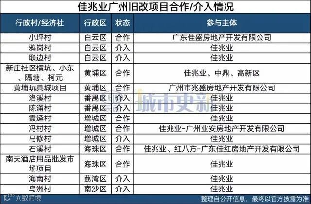 乐居城更不完全统计,目前,佳兆业在广州白云区、黄埔区、增城区、番禺区等7个区,合作、介入旧改项目共有14个,合作有小坪村、霞迳村、冯村村等,介入项目有洛溪村、陈涌村、马修村等。