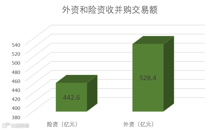 2. 据初步统计,外资收并购金额达528.4亿元,占总交易额的34%;险资收并购金额约442.6亿元,占总交易额的28%。