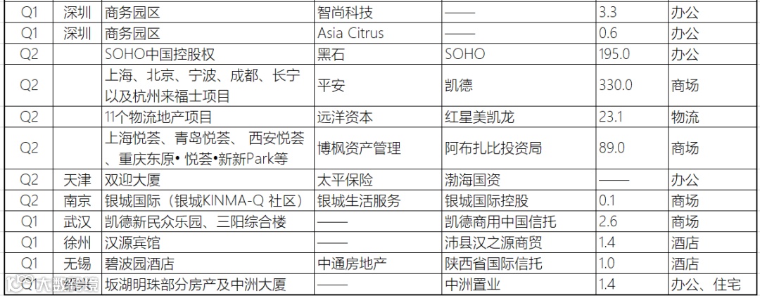 1. 外资“休假”回潮,融资能力较强的险资接盘优质资产,二者共同推动了上半年国内投资市场的几笔大金额及资产包的投资交易。