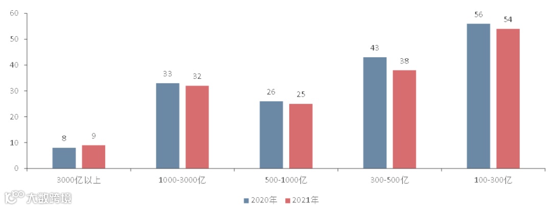 2021年,千亿房企维持在41家,同时共计158家房企跻身百亿军团,但内部阵营分化加剧。面对行业融资紧张的形势,房企不再单纯追求规模扩张。3000亿以上、1000亿-3000亿、500亿-1000亿、300亿-500亿、100亿-300亿房企分别为9家、32家、25家、38家、54家。