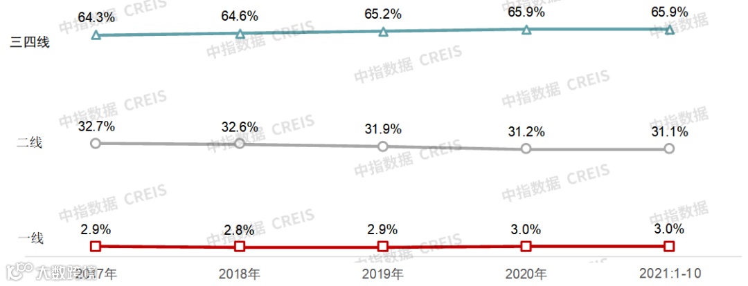 2021年,二线城市继续成为百强房企的业绩后盾。中指研究院监测的50家百亿代表企业中,二线城市业绩贡献占比为58.1%,但较2020年微降0.2个百分点;三四线城市业绩贡献率为23.4%,同比增长0.3个百分点;一线城市业绩贡献率为18.5%,总体保持稳定。