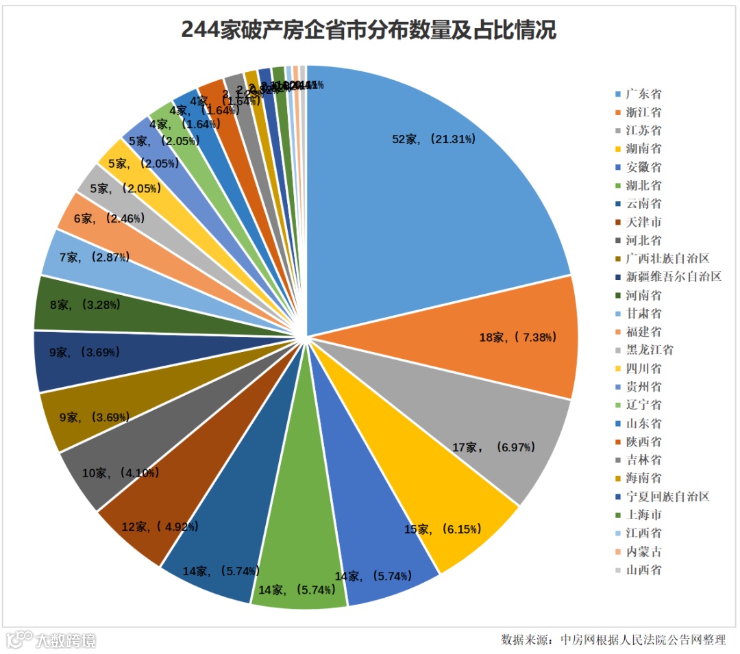 分省域来看,广东省以52家位列破产房企数量的首位,占全部破产房企的21.31%,其次是浙江省18家居第二,江苏省17家位列第三,湖南省15家居于第四,安徽、湖北和云南三省以各14家并列第五位,这7个省份的破产房企数量约占年内破产房企总量的60%。