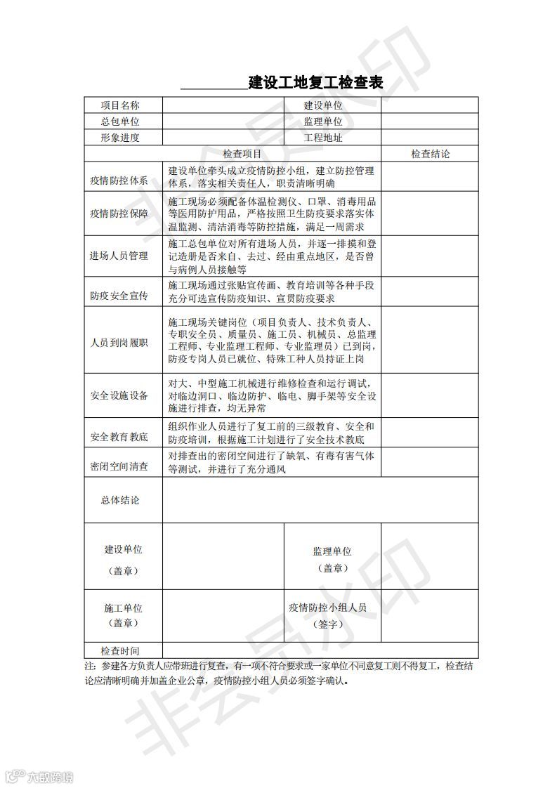1、复工/开工检查应按照参建单位自查、疫情防控小组复查、主管部门核查/备案(水务工程)流程进行。