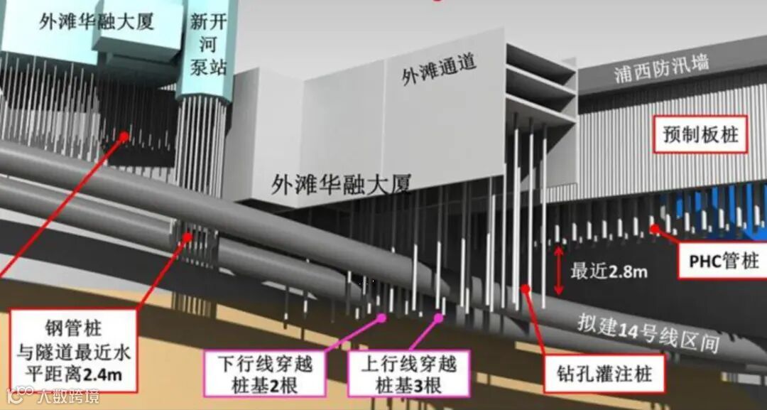 大世界站~豫园站区间穿越10号线,垂直距离为最小为1.4米,侧穿城市广场桩基,垂直距离约1.2米,穿越金陵东路两侧住宅古旧小区,区间最小转弯半径350米。
