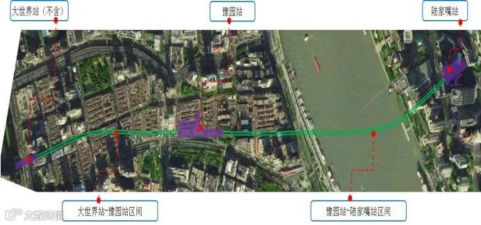 豫园站~陆家嘴站区间从豫园站始发,穿越新永安路两侧老旧住宅小区,穿越外滩通道(且遇到外滩通道的5根钻孔灌注桩)、穿越浦西浦东防汛墙、穿越黄浦江,最后在陆家嘴站接收。该区间为目前上海在建轨道交通覆土最深的区间(埋深约43.3米),区间长度1260米。