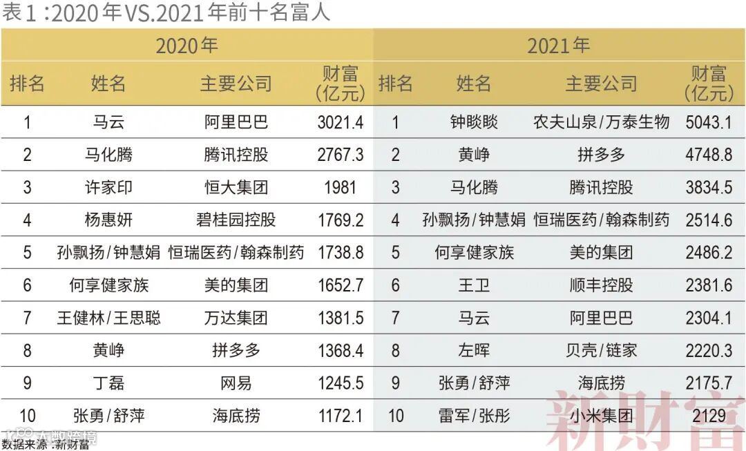 相较于2020年,2021年的前十富人榜单发生了较大变化,而这在一定程度上也反映出经济结构的巨大分化。