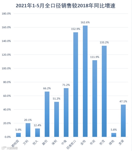 中海2021年1-5月的全口径销售额较于2018年同期,同比增幅达71.2%,是TOP6中,增幅最高的。