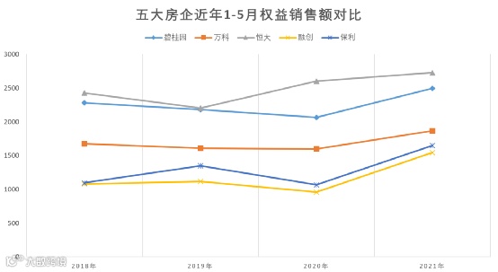 数据说话,如果单从权益的角度,万科已被恒大和碧桂园甩下。比如,2021年1-5月,万科权益口径销售额1867.1亿,是三巨头中唯一没上2000亿的,比恒大少了860亿、比碧桂园少了680亿。