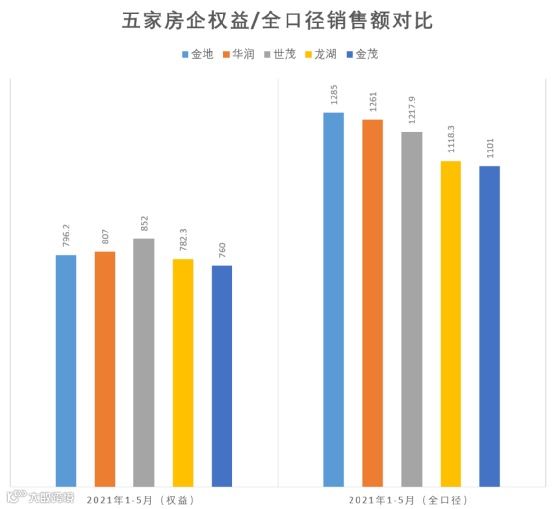 之所以说是混战格局,是因为不管是全口径销售额(最大剪刀差不到200亿),还是权益销售额(最大剪刀差不到100亿),五家房企都没拉开明显的差距。