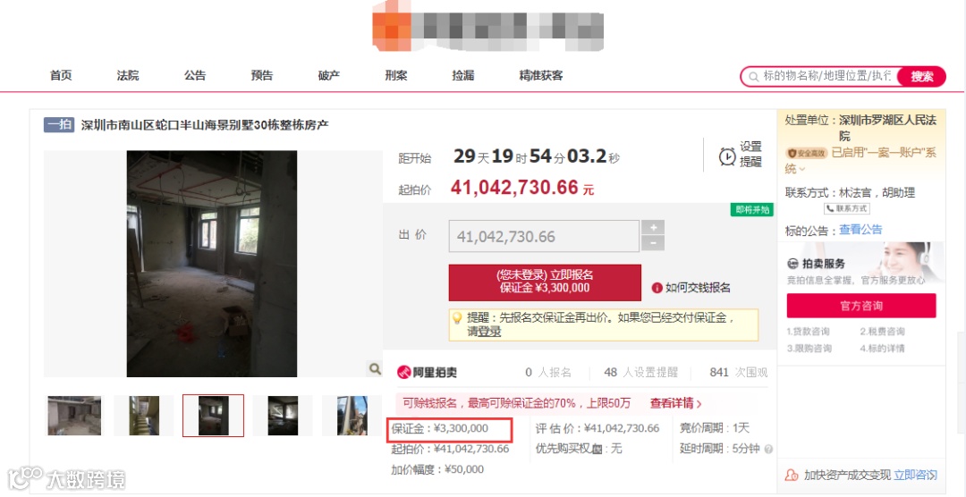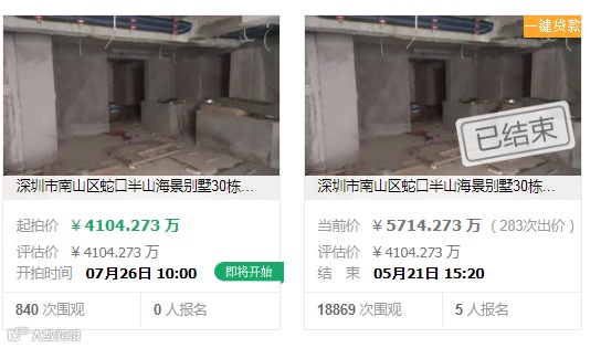 就在2021年5月20日至5月21日,广东省深圳市罗湖区人民法院在拍卖平台上对深圳市南山区蛇口半山海景别墅30栋整栋房产进行拍卖,起拍价4104.273066万元,共有5人各自缴纳保证金330万元报名,经过283次出价,最终成交价5714.273066万元,增值幅度逾39.22%。按成交价测算,该别墅建面折合每平方米18万元。
