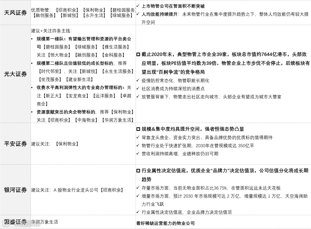 券商基于此背景推荐的物管个股,大致可以归为二类:第一类:背靠资金实力突出、具备品牌优势的优质龙头房企。第二类:非住业态中具备强管理能力的房企。具体如下: