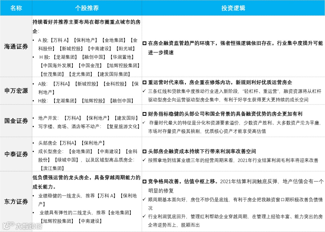 地产板块2020年以来走势疲软,超跌明显。2021年“房住不炒”基调不变,“三道红线”或许带来行业粗放性发展状况的出清开启,引导行业持续健康发展。基于以上行业背景2021年券商看好的房企,大致可以归为三类:第一类,具备融资优势、财务稳健的龙头房企;第二类:管理上经验丰富、能力突出的强运营房企;第三类: 拥有核心资产以及产业链上下游多元经营的房企。具体如下: