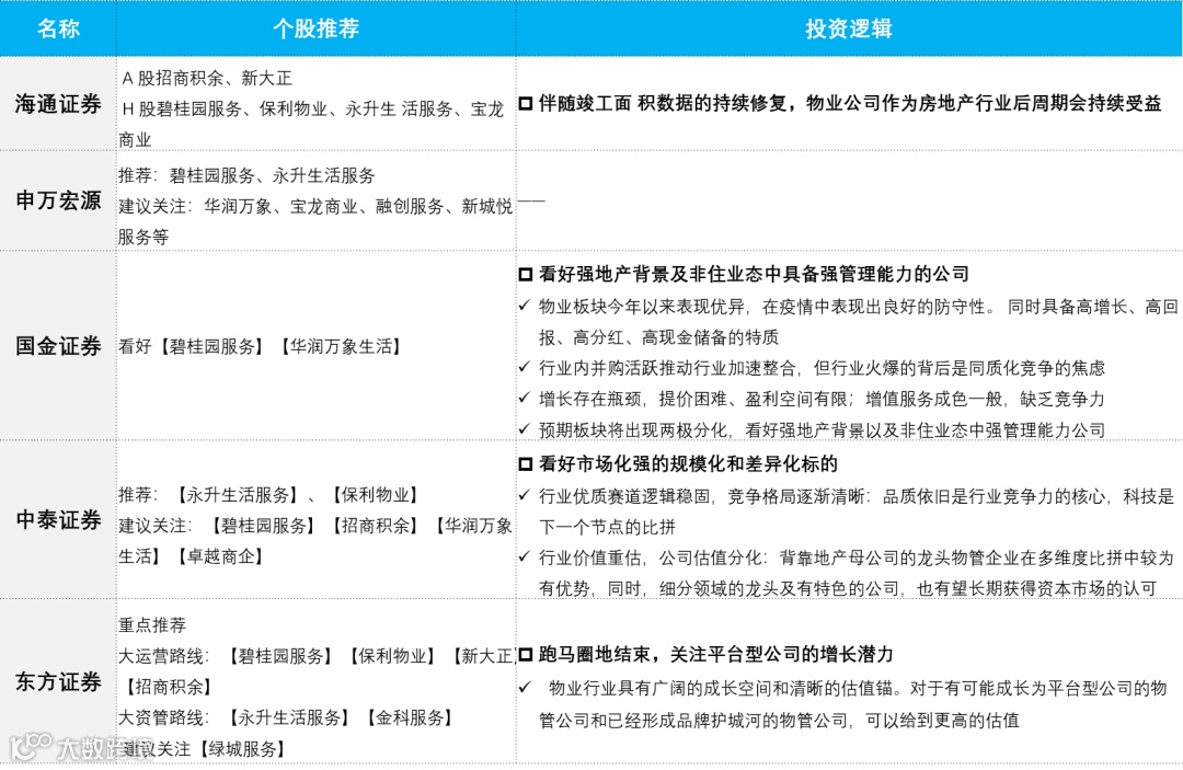 此类券商看好的优质企业有:碧桂园服务、保利物业、新大正、招商积余、永升生活服务等 。