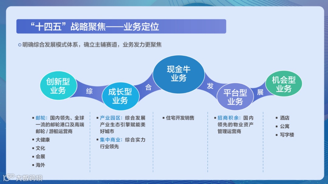 许永军将其称之为“1+4“战略,简单的说,“1”代表着的是住宅开发的现金流业务,是支撑招商蛇口未来5-10年发展的核心支柱。“4“则是以成长业务为核心,平台型业务为抓手,创新业务为载体,以及机会型业务组成的综合发展模式。
