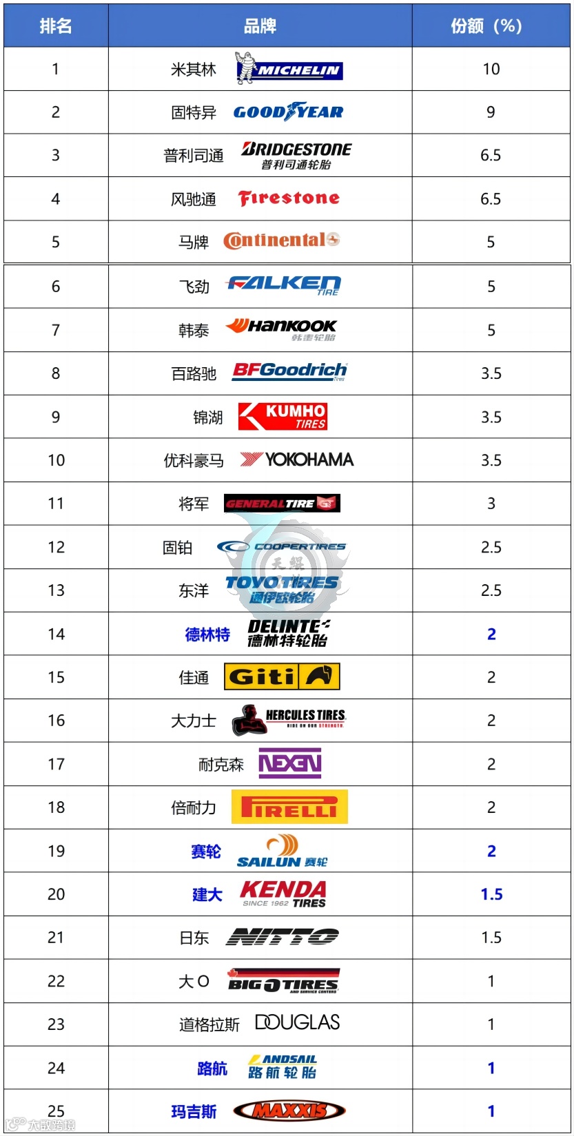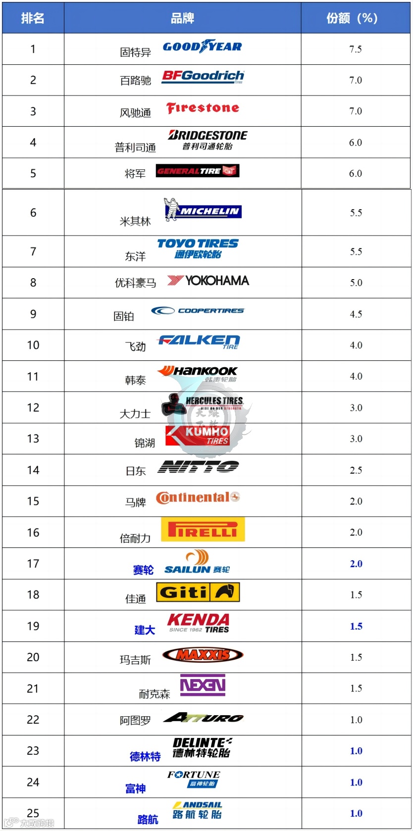 表2 美国轻型载重汽车轮胎品牌替换市场TOP25